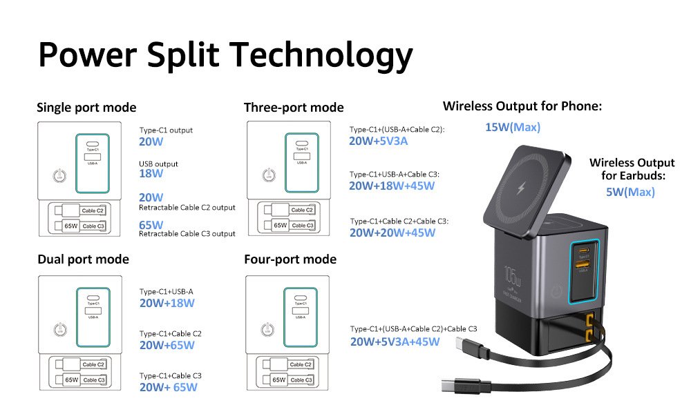 The ultimate all-in-one charging solution! This compact tower combines a powerful 105W GaN fast charger with 5 wireless charging stations, designed to declutter your space and power all your devices at once.