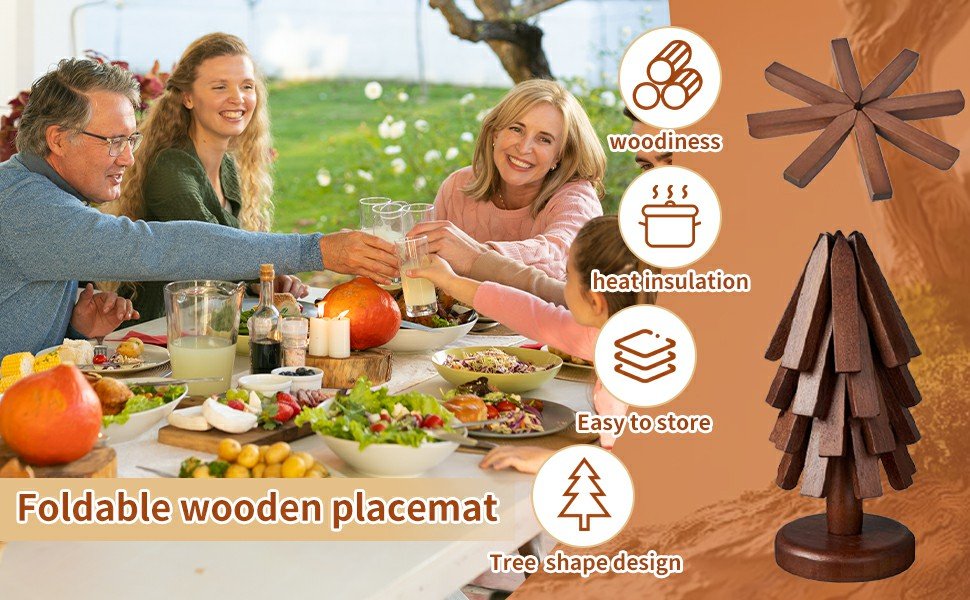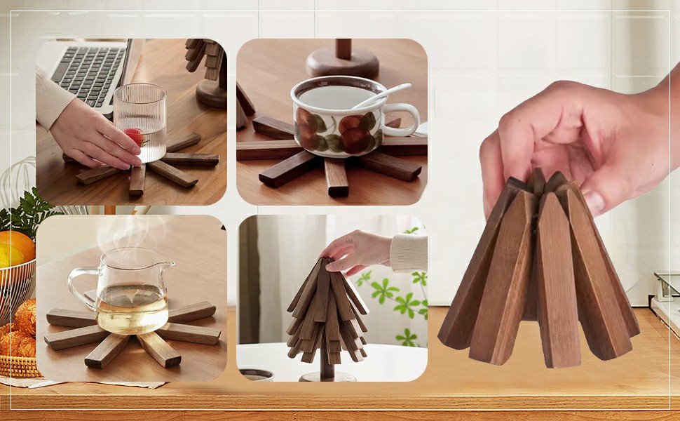 Multi-Functional Use: Wooden trivets for hot dishes unfolds 7.8 inches, can put cups, bowls, plates, teapots, frying pans, hot pots, etc., can be used for different textures of countertops such as glass, marble, wood, etc