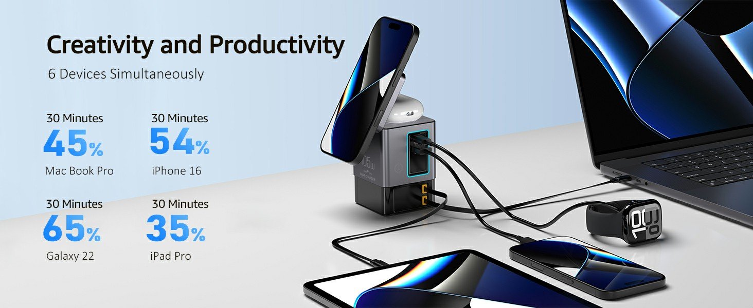 WHAT WILL YOU GET: 1*6 in 1 Charging Station, 1*PD 45W Adapter, 1*1.3ft USB-C Cable (for iPad), 1*3.3ft USB-C Cable (for power input), 1*User Manual, 18 month warranty, and 24 hour friendly