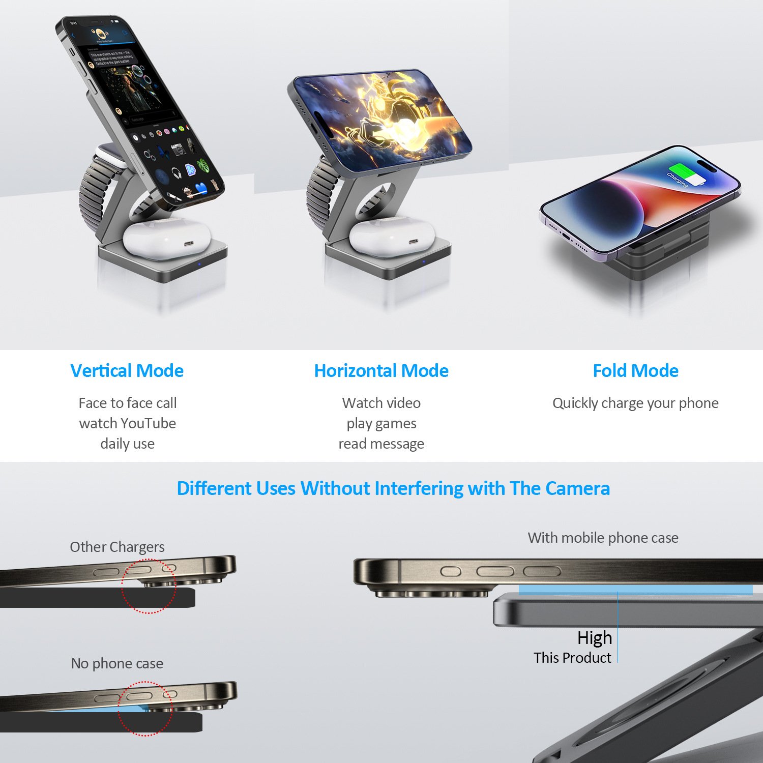 Magic 15W Magnetic 3-in-1 Wireless Charger for Samsung, Apple, Phones, Watches, and Headphones with Automatic Retractable Bracket