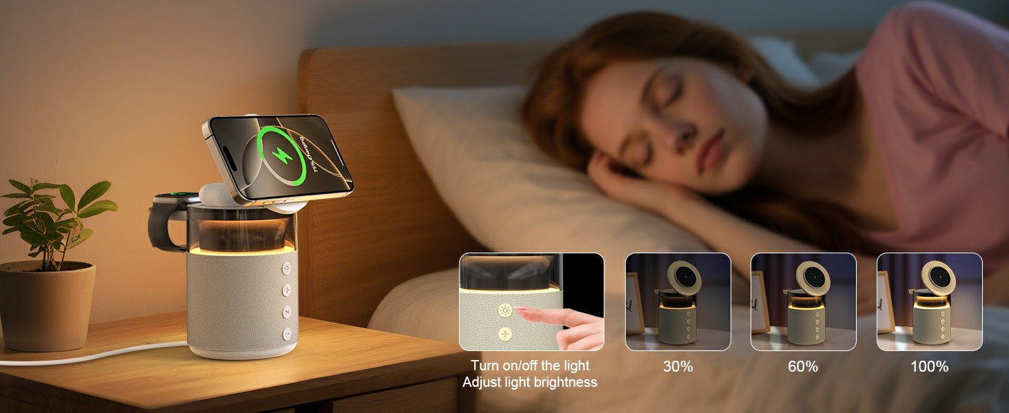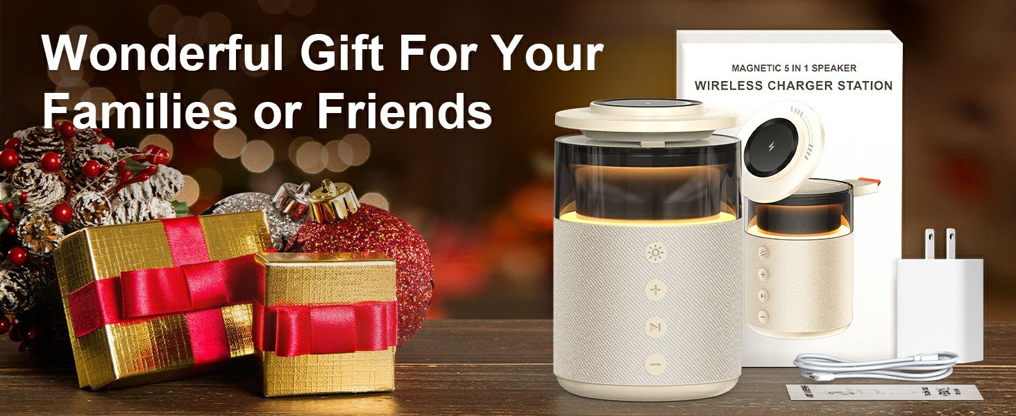 1. 5-in-1 Multifunctional Powerhouse: Charge, Play, and Illuminate in One: Combines magnetic fast charging (Compatible with iPhone 12/13/14/15/16/17 pro max all series, Compatible with Apple Watch All Series, and Compatible with AirPods 2/3/Pro/Pro 2 and other wireless earbuds), a 360° immersive stereo speaker, and a touch-adjustable night light—all in a sleek, compact design. Replace tangled cables and multiple devices with this all-in-one solution, perfect for home, office, travel, or camping.