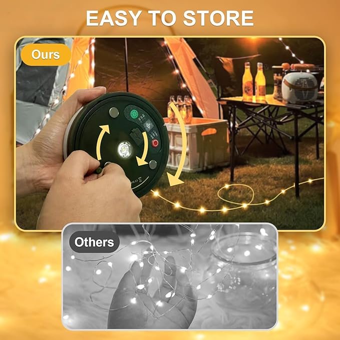 Portable & Convenient: The retractable led camping string light features a handle which allows you to roll in all 33 feet of string light in <30s into its shell for quick storage – eliminating the hassle of untangling the lines when storing the light strands. Weighing only 7.4 oz, the camping lantern’s ultra-lightweight design fits any backpack seamlessly or be carried on-the-go, ready for any adventure.