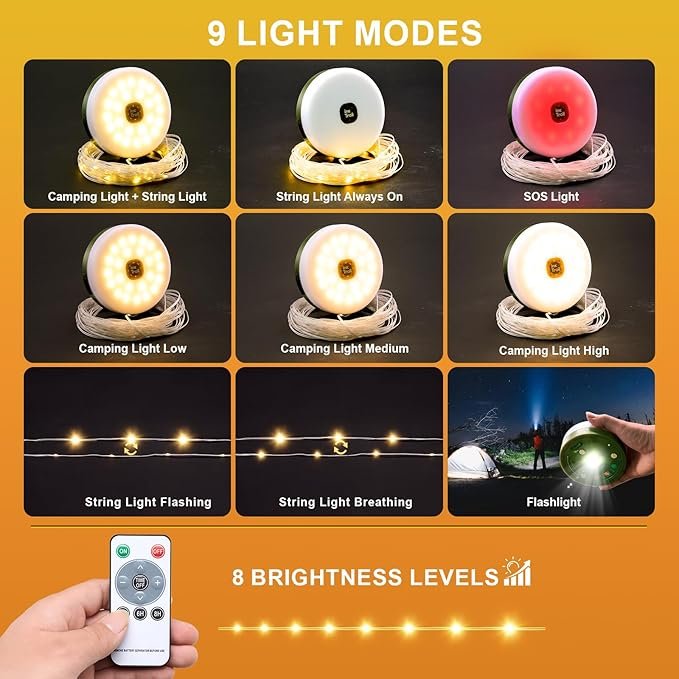 9 Lighting Modes + Remote Control: Our outdoor string light comes with warm white LED light and has 9 different modes which can be remote controlled – 1)string lights on 2)string lights quick flash 3)string lights slow flash 4)strong camping light 5)medium camping light 6)soft camping light 7)string light + camping light 8)SOS light 9)flashlight – providing the perfect ambiance for every scenario. The lights are also dimmable with 8 brightness levels that can be adjusted using the remote.