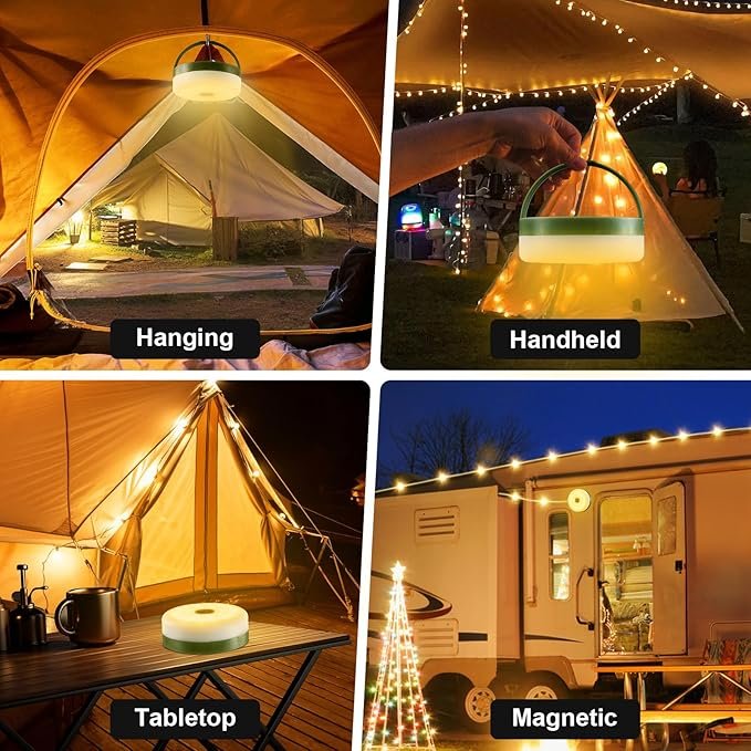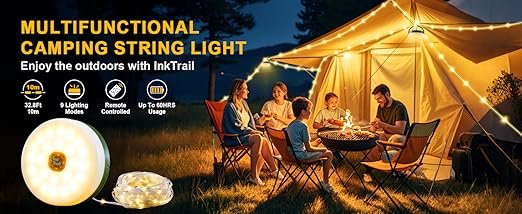 Weatherproof & Easy to Set Up: Crafted from premium ABS/PC materials, the InkTrail tent string lights for camping is durable and waterproof, ensuring reliable performance in even rainy conditions. It also comes with a magnetic base to attach to surfaces such as car hood when performing maintenance work, and a hook for hanging in tents, RVs, Christmas trees, branches, or various stands.