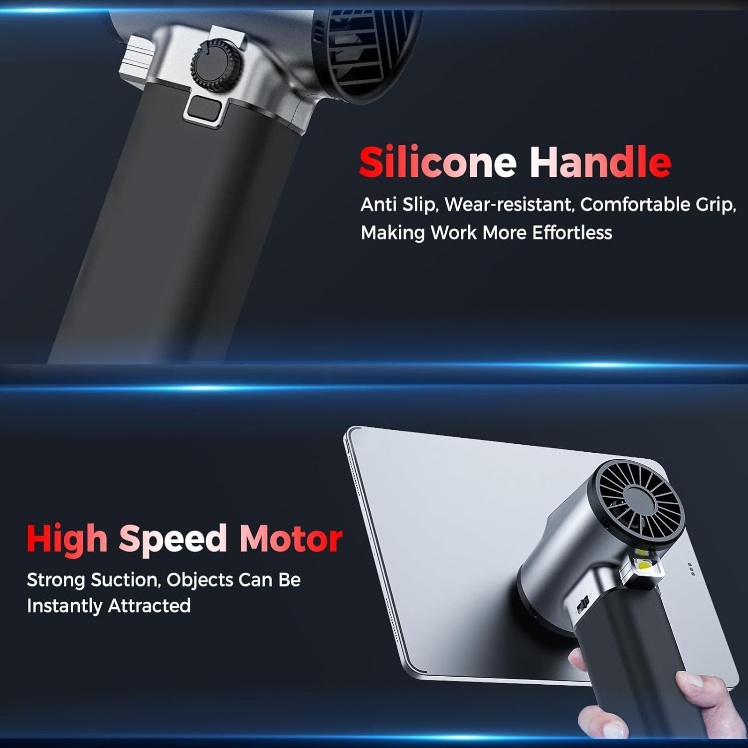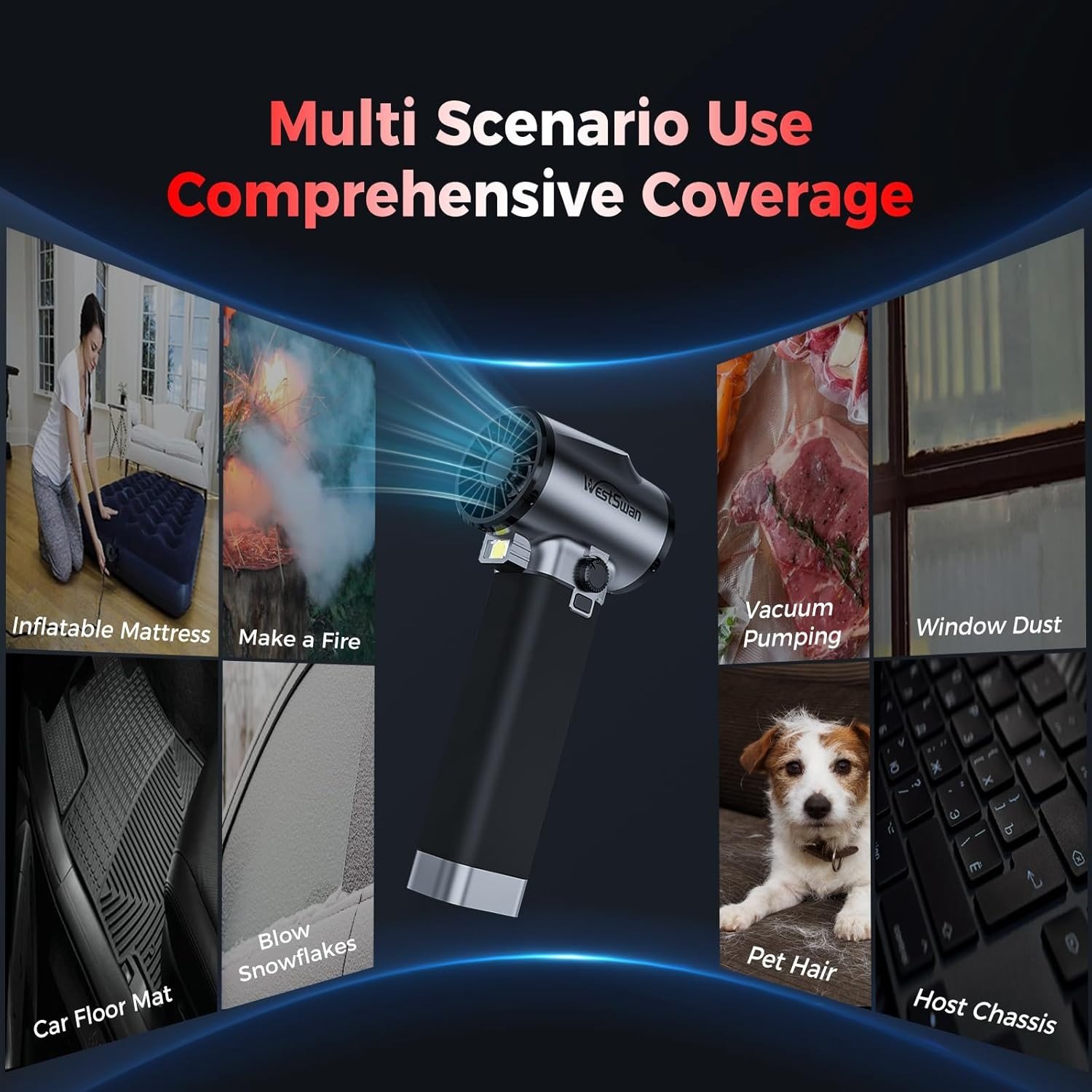 【Continuously Variable Speed Knob】Turn the knob and you can get blowing speed you want. Adjust it from minimum to maximum, the range of the generated thrust is 0-1000g. Our car blower can better ensure the safety of use. For different usage scenarios, you can adjust to the right blowing speed, including car drying; snow blowing; yard cleaning; window, indoor, pet hair cleaning, etc.