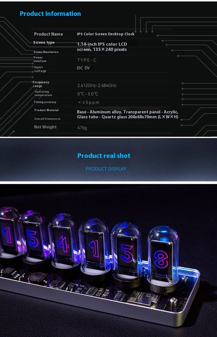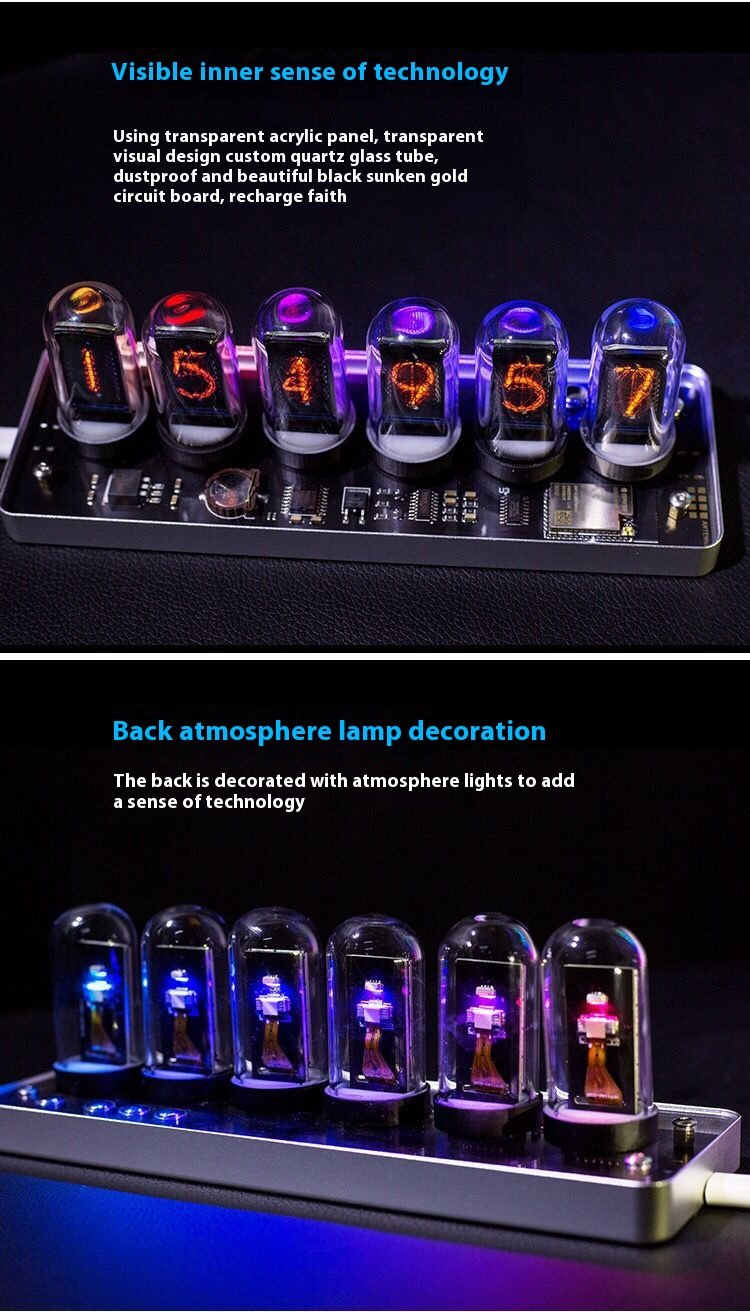 Showcasing a sleek and innovative style, this alarm clock combines cutting-edge aesthetics with multi-functional features. The transparent design reveals premium internal components, including elegant quartz glass tubes and a sophisticated black gold-plated PCB.