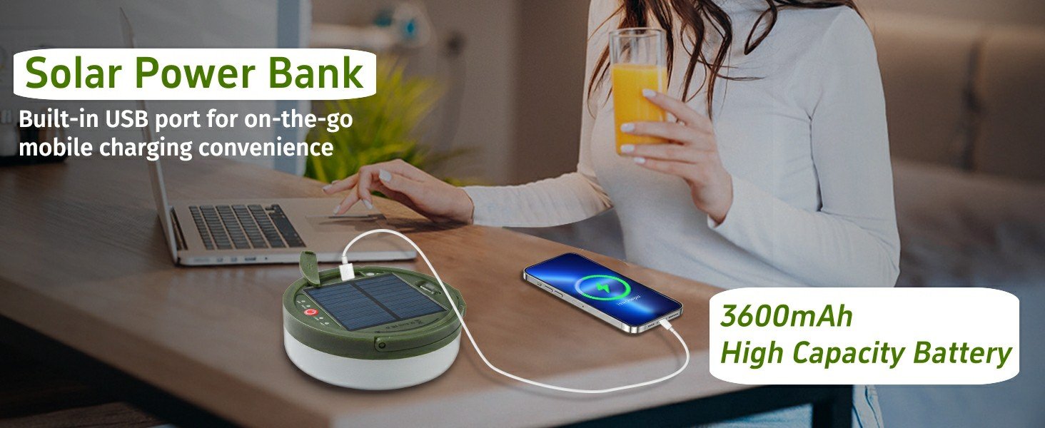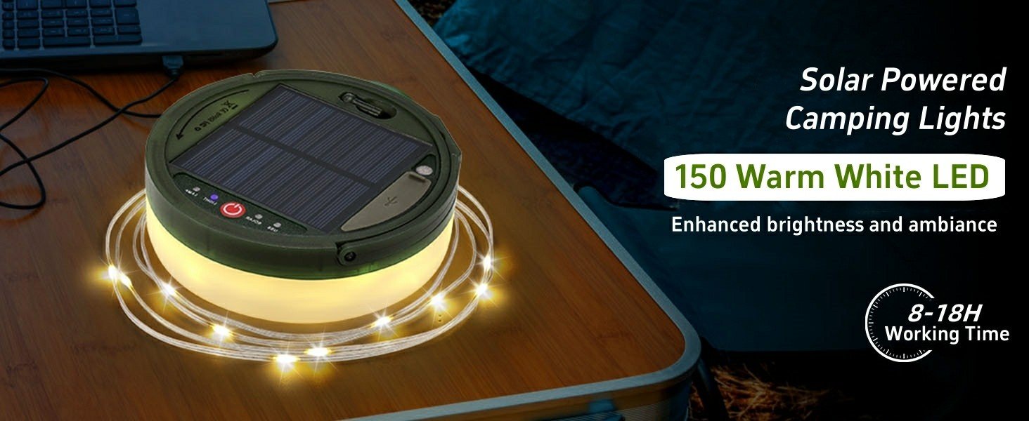 🎁【Solar & USB Rechargeable】- With a built-in 3600mAh battery, our Solar Camping Lights charge in just 8 hours under the sun or 4 hours via USB-C cable. Get up to 8 hours of full brightness or a whopping 18 hours at minimum brightness for extended outdoor use.