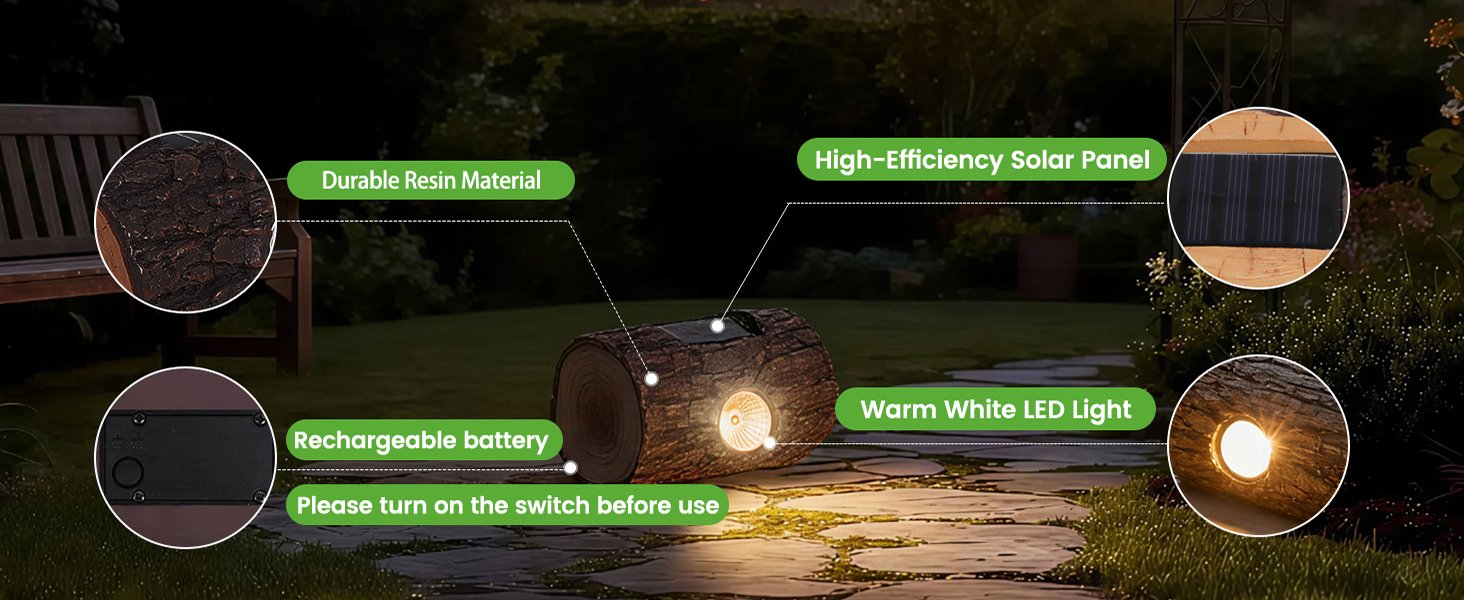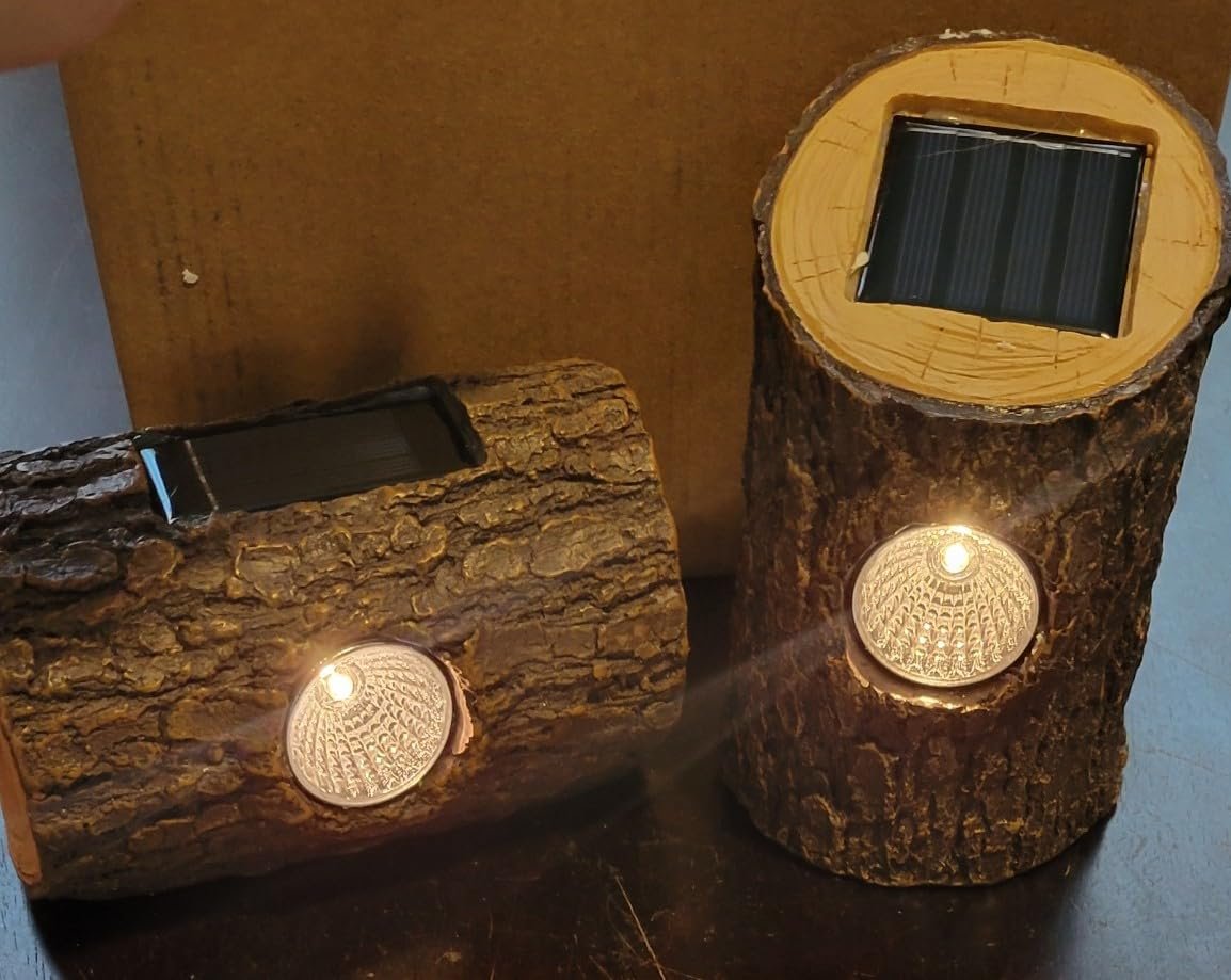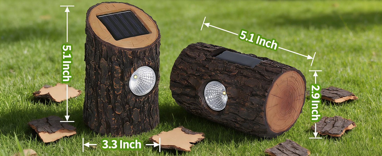 【DECORATIVE SOLAR GARDEN LIGHTS DESIGN】 – Decorative Solar Garden Lights with Rustic Tree Stump Design – Made of durable resin, these solar pathway lights outdoor add a natural, artistic touch to lawns, patios, walkways, and decks. The 2 pack includes two unique shapes, creating more variety in your garden decor.